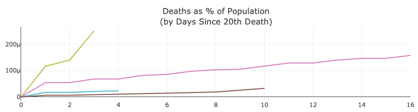 Over the last two days (day nine and ten since their 20th death), the US has seen a jump in deaths from 63 to 108. This is not good. However, if Percentage of the Population with Deaths is an indicator of conditions on the ground, then, in the big picture, this jump in the US is less worrisome. Further, under this assumption, the Netherlands numbers don’t look that encouraging.