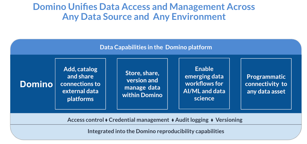 Domino's Fall ’23 release empowers enterprises to build AI solutions faster and more responsibly. It combines the benefits of AI project templates and Generative AI capabilities, using more data from more sources. You get more data with more control thanks to Data Access Audit Logging. Domino continues to help leading enterprises deliver AI solutions on time and on budget. They get AI done without compromising security or responsible practices.
