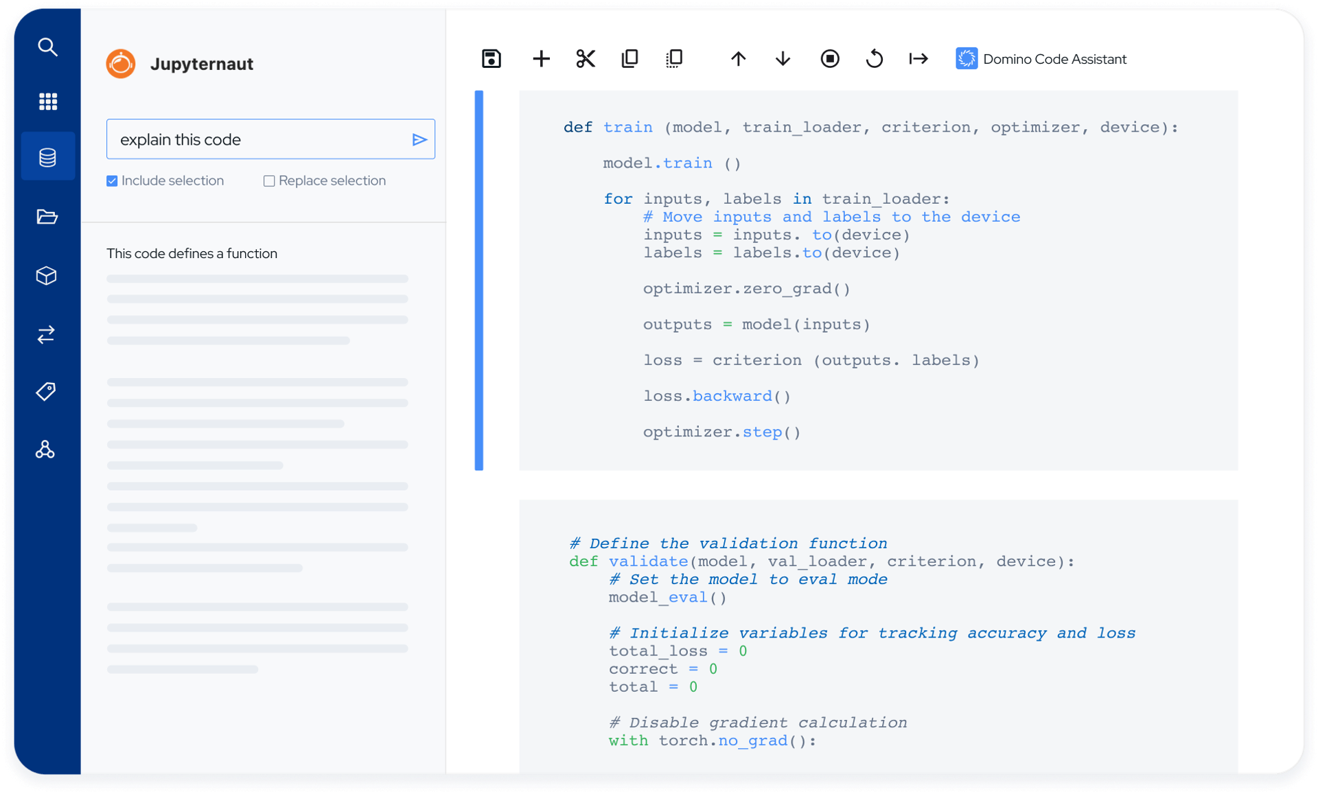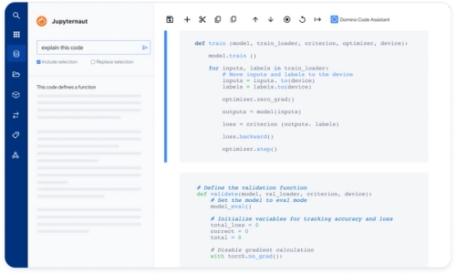 Domino empowers data scientists with Jupyter AI. Select a coder model from the top LLM providers. Get broad support for a wide range of programming languages. Cut time wasted on mundane tasks with automated code and notebook generation. Let the model RTFM and get answers faster than Googling. An unintrusive chat interface lets you control how you interact and get help from the AI. Learn more.