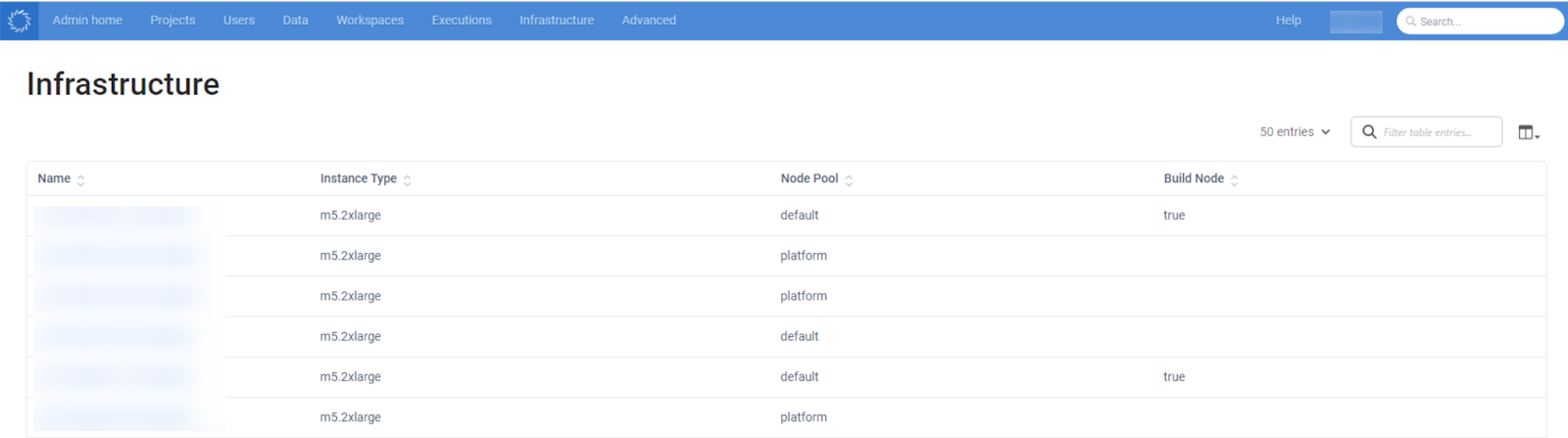 To illustrate, in Figure 1 below, the non-GPU workspaces created within Domino will run on the node pool “default”. Note that the instances listed here are of type “m5.2xlarge” and the node pools are only “default” and “platform”.