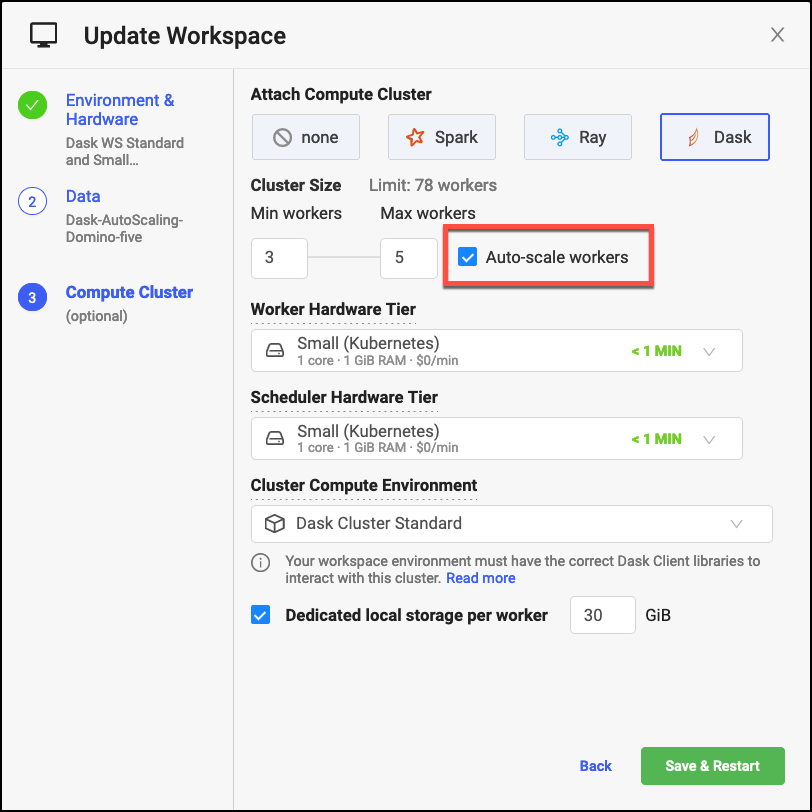 A user can set up a cluster with auto-scaling distributed compute with just a few clicks. As shown in Figure 5, Domino will spin up a cluster with three Dask workers and if the average CPU/memory utilization exceeds the configured value, the number of workers will be scaled up to a maximum of five workers.