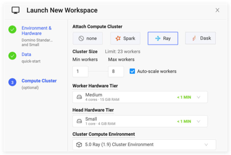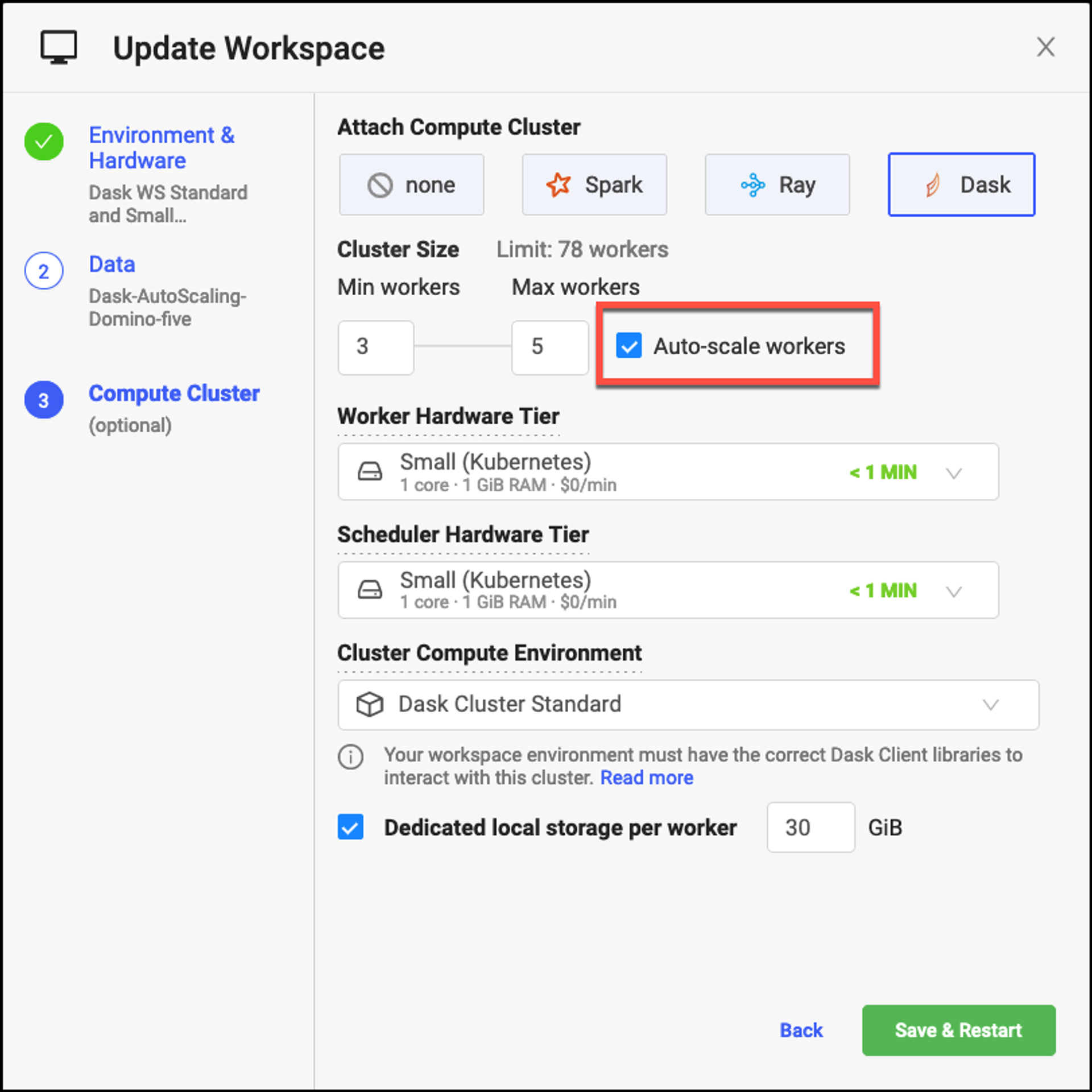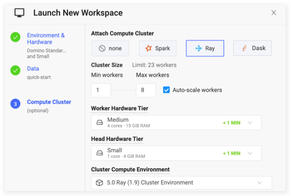 In addition to autoscaling of the compute nodes using cluster autoscaler, Domino 5.0 has the capability to autoscale Spark, Ray, and Dask on-demand clusters. This is will enable the data scientist to begin with a small cluster and scale as needed based on the fluctuating demands of the job.