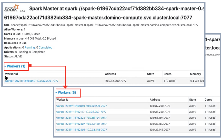 Domino will keep adding workers until the max worker limit is reached. Figure 6 shows an example where a cluster started with one worker and scaled up to five workers as the resource utilization thresholds were exceeded.