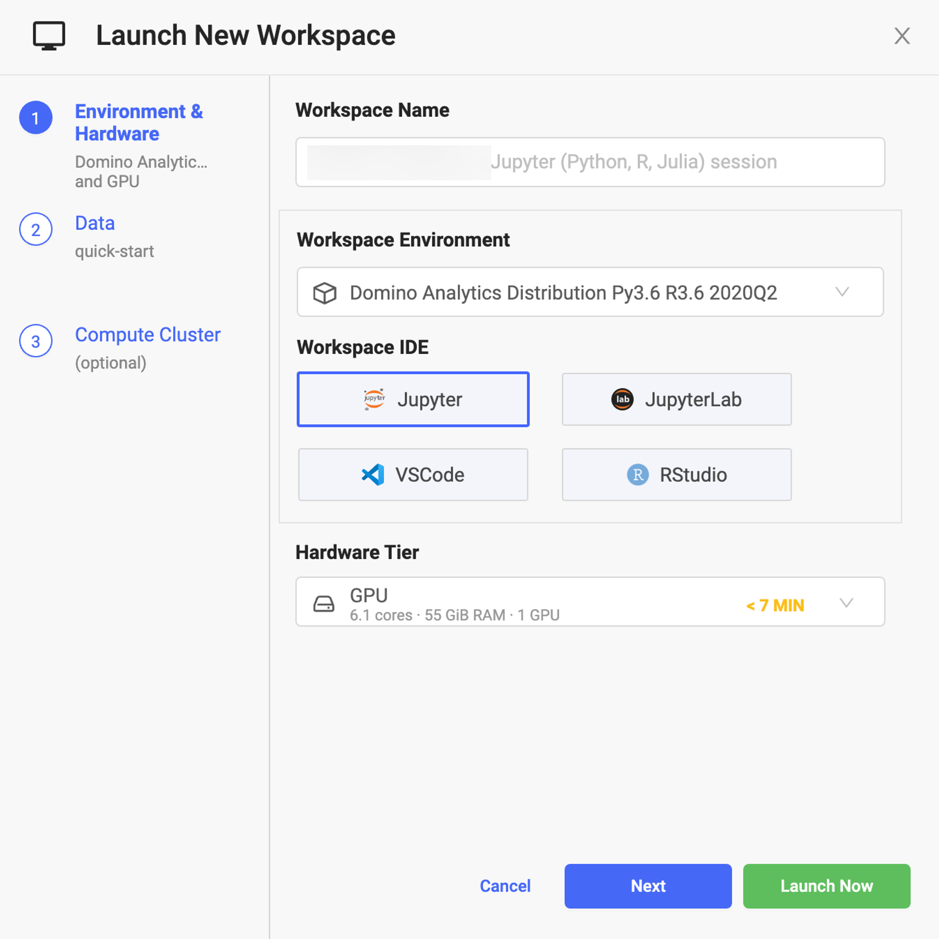 Now, imagine starting a new GPU workspace (Figure 2). Domino will run the workspace on nodes with the underlying node pool labeled “default-gpu”.