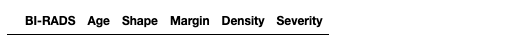 names = ['BI-RADS', 'Age', 'Shape', 'Margin', 'Density', 'Severity']