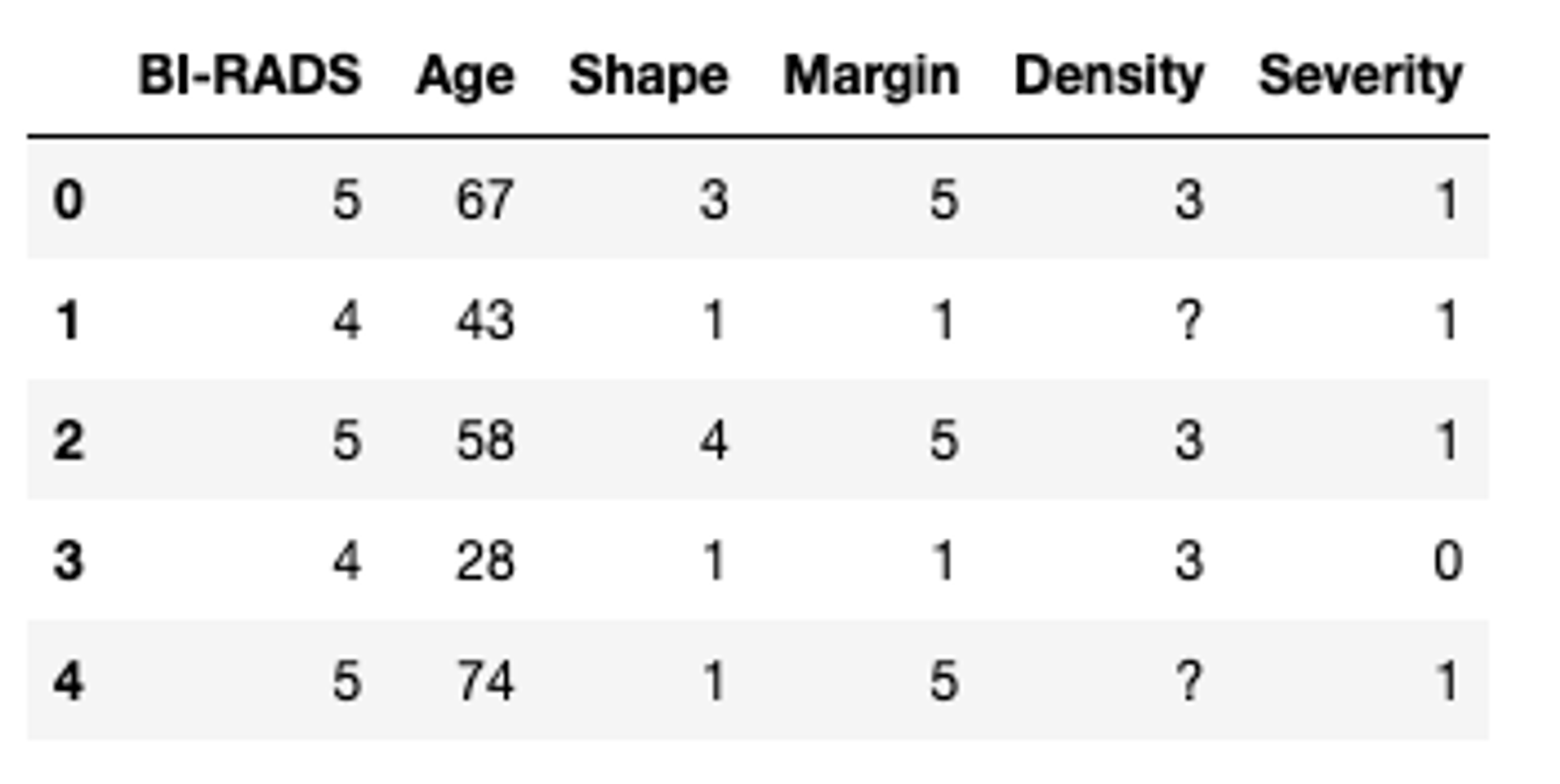 BI-RADSassessment: 1 to 5 (ordinal)Age: patient's age in years (integer)Shape: mass shape: round=1 oval=2 lobular=3 irregular=4 (nominal)Margin: mass margin: circumscribed=1 microlobulated=2 obscured=3 ill-defined=4 spiculated=5 (nominal)Density: mass density high=1 iso=2 low=3 fat-containing=4 (ordinal)Severity: benign=0 or malignant=1 (binomial)