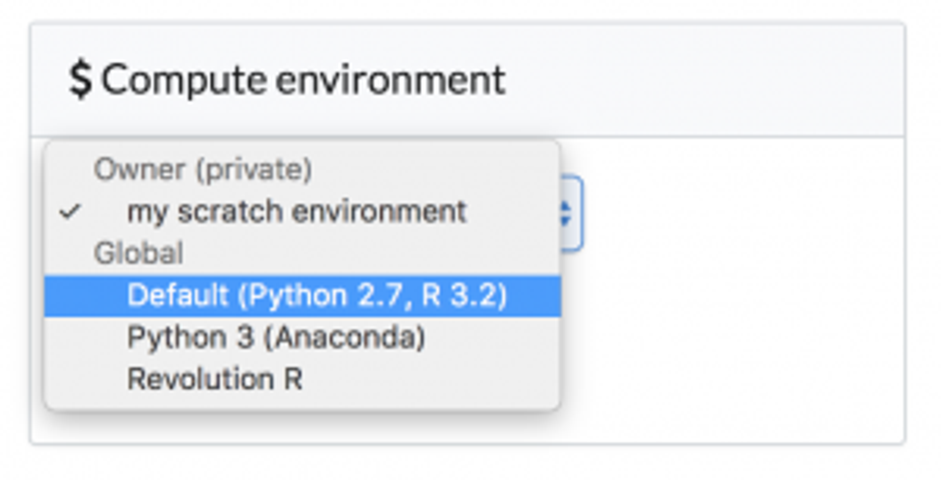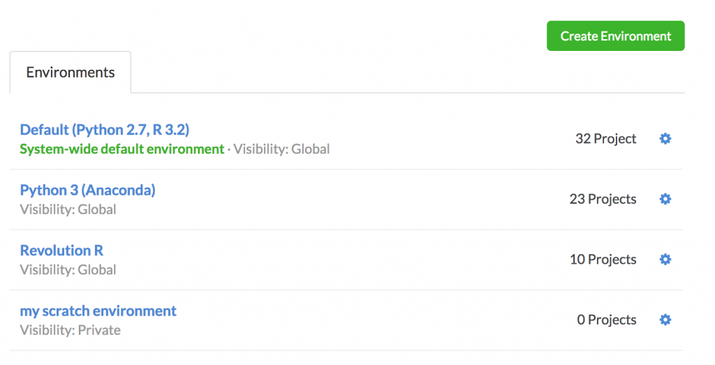 Let's say some of your users work with Python 3 and some work with Python 2. Or some work with the standard R distribution and others work with a Revolution Analytics distribution of R. You can create environments for each of these configurations, and data scientists can choose whichever they want to use when they work: