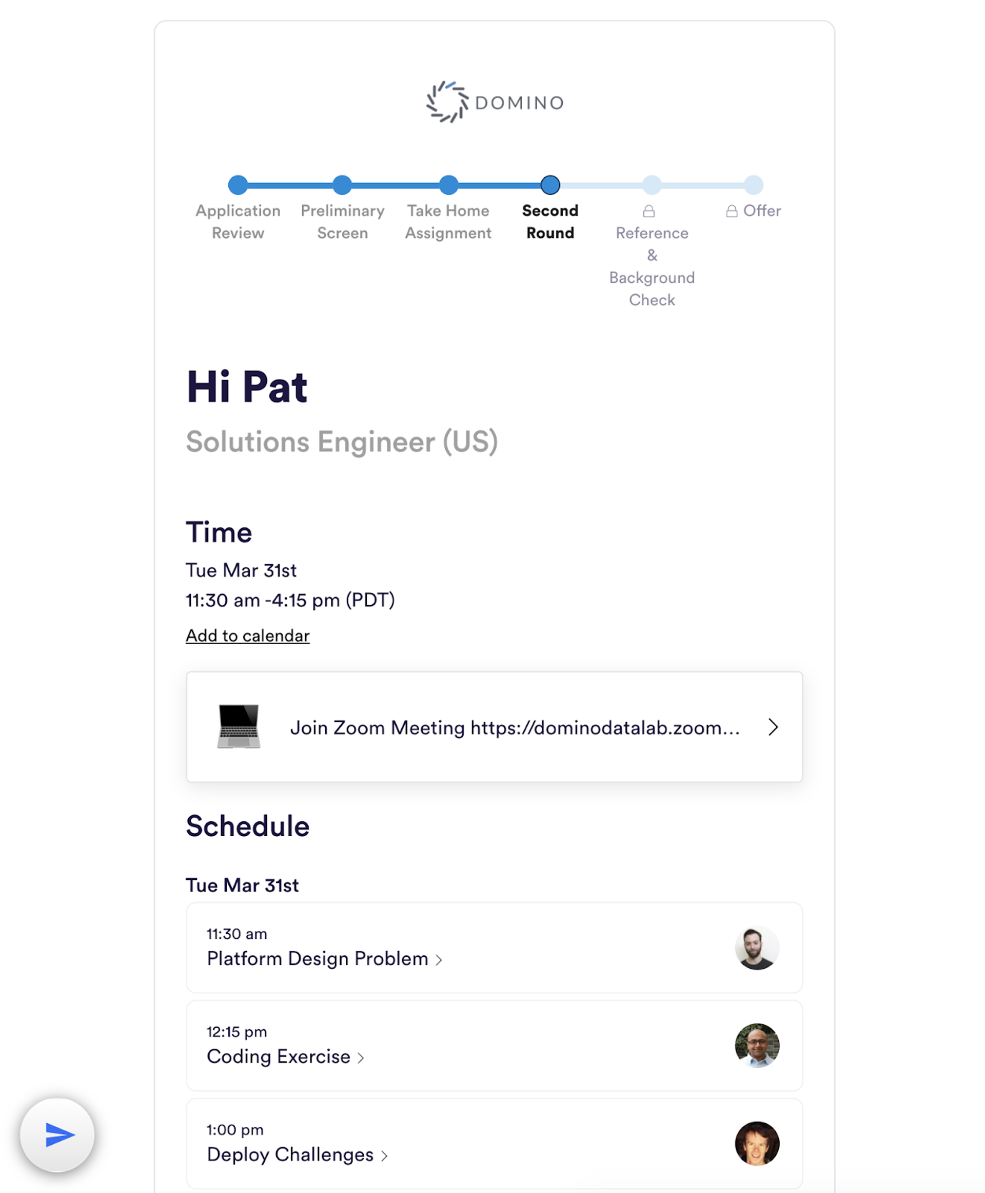 Even before lockdown came into practice across the US, we proactively moved our interview process to 100% remote. Domino now conducts all our interviews over Zoom. Given that this is a major change to how people normally interview, we introduced interview guides which help candidates know who they’re meeting when, how to connect to their Zoom interviews, and gives them a chat box to connect directly with our recruiting team in real time.