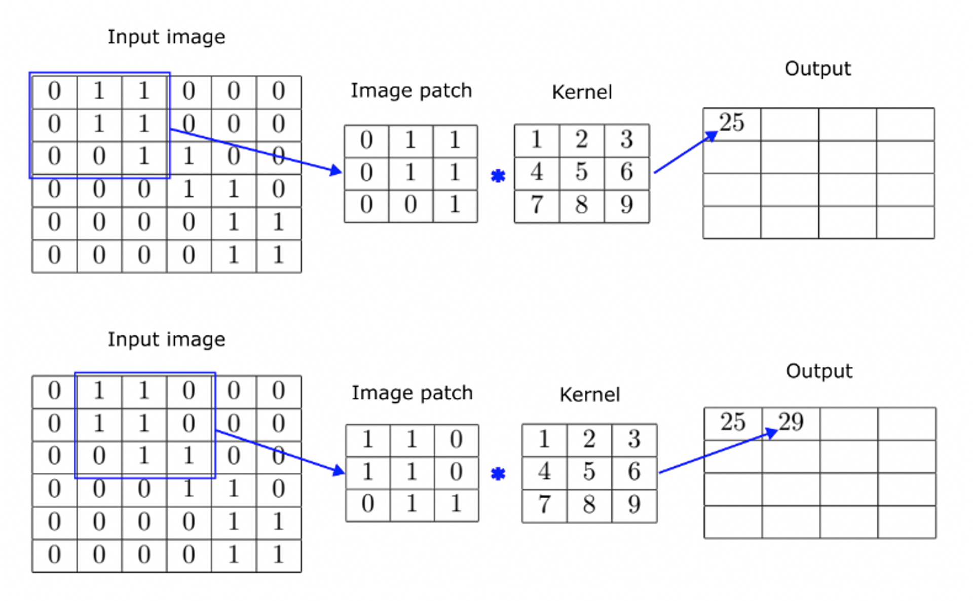 A convolutional layer in a CNNs uses a kernel or a filter, which is simply another matrix of smaller dimensions (e.g. 3x3, 5x5 etc.). The kernel is slid over the image, operating over patches of identical size. The current patch and the kernel are then convolved by performing element-wise matrix multiplication and adding the resulting elements together to produce a single scalar. This process is illustrated below.