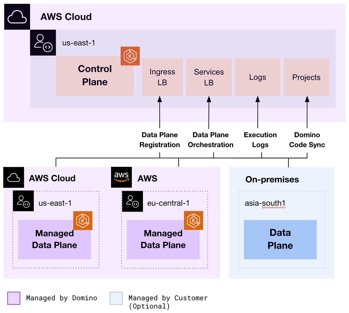 - Each Managed Data Plane is also hosted and managed end-to-end by Domino, in your choice of region (for example, us-east-1 or eu-central-1). These are where data resides, and compute takes place, isolated from each other and the control plane.