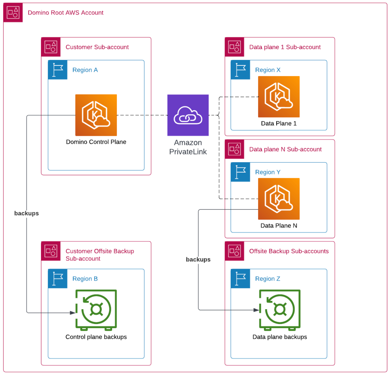 - Data locality: All compute and storage remain inside a Domino-managed AWS account, with each data plane tied to a particular region for compliance, cost, and compute efficiency.