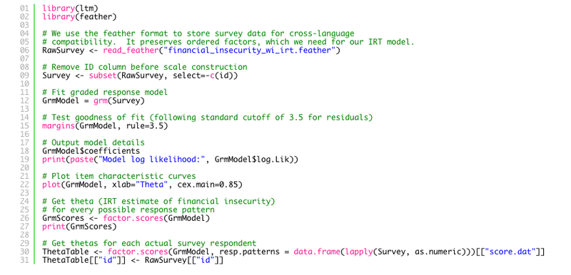 Item response theory offers a perfect solution to problems such as this, where we need to aggregate a number of discrete observations about an individual (in this case, survey responses) into a single overall scale. IRT is a family of latent variable models commonly used in psychometrics (the applied psychological science underlying many achievement tests), so using it to roll up survey responses related to financial insecurity is a somewhat novel application.