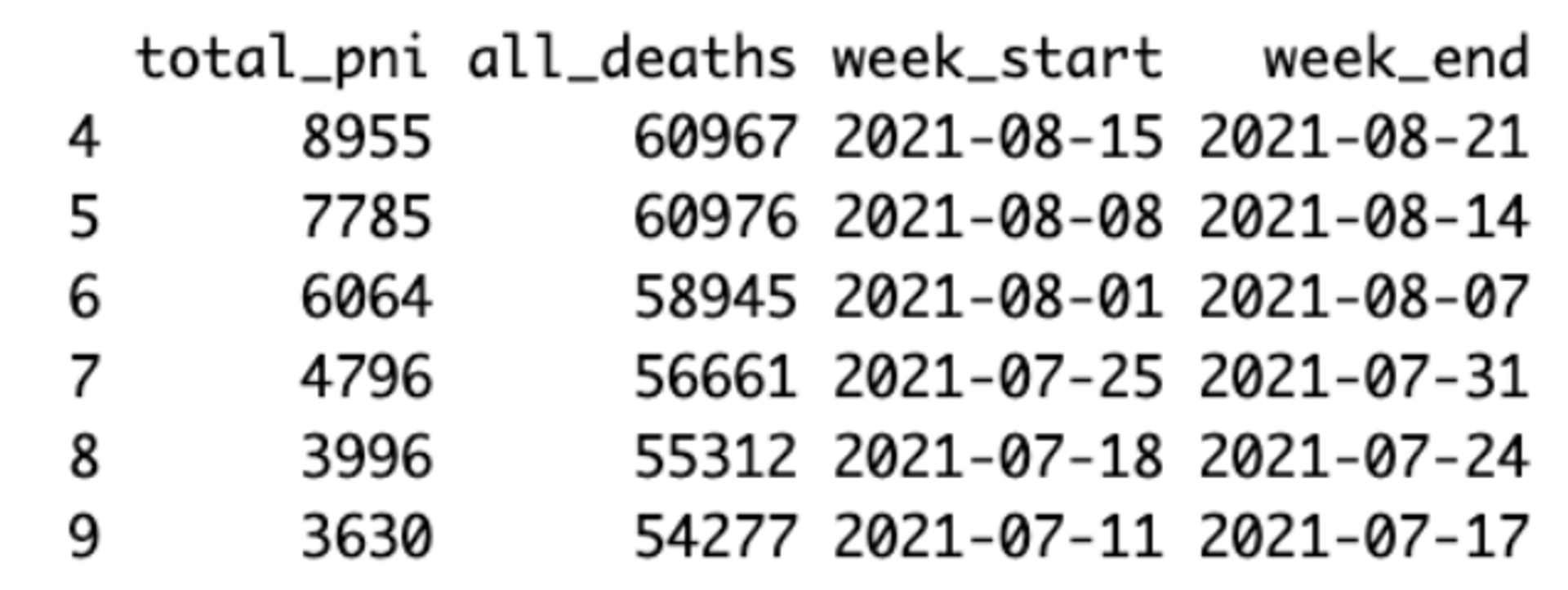df <- df[c('total_pni','all_deaths','week_start', 'week_end')]
