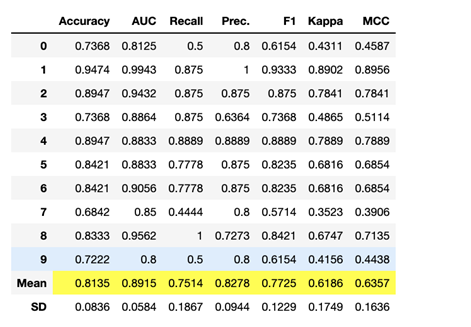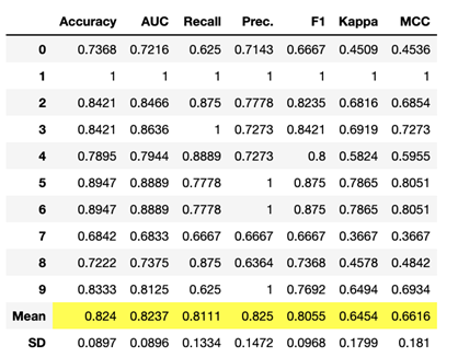 From compare_models, we were easily able to see the best baseline models for each metric, and select those for further investigation. For example, if we were looking for the model with the highest AUC above, we would have elected to continue with random forest. We can then save and fine tune our model using the create_model and tune_model functions.