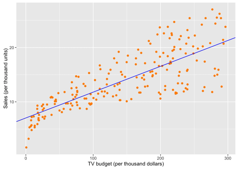 # plot fitggplot(adsData, aes(x=TV, y=Sales)) + geom_point(col="darkorange") +geom_abline(intercept = lmFitCoef[1], slope = lmFitCoef[2], col="blue") +ylab("Sales (per thousand units)") + xlab("TV budget (per thousand dollars)")