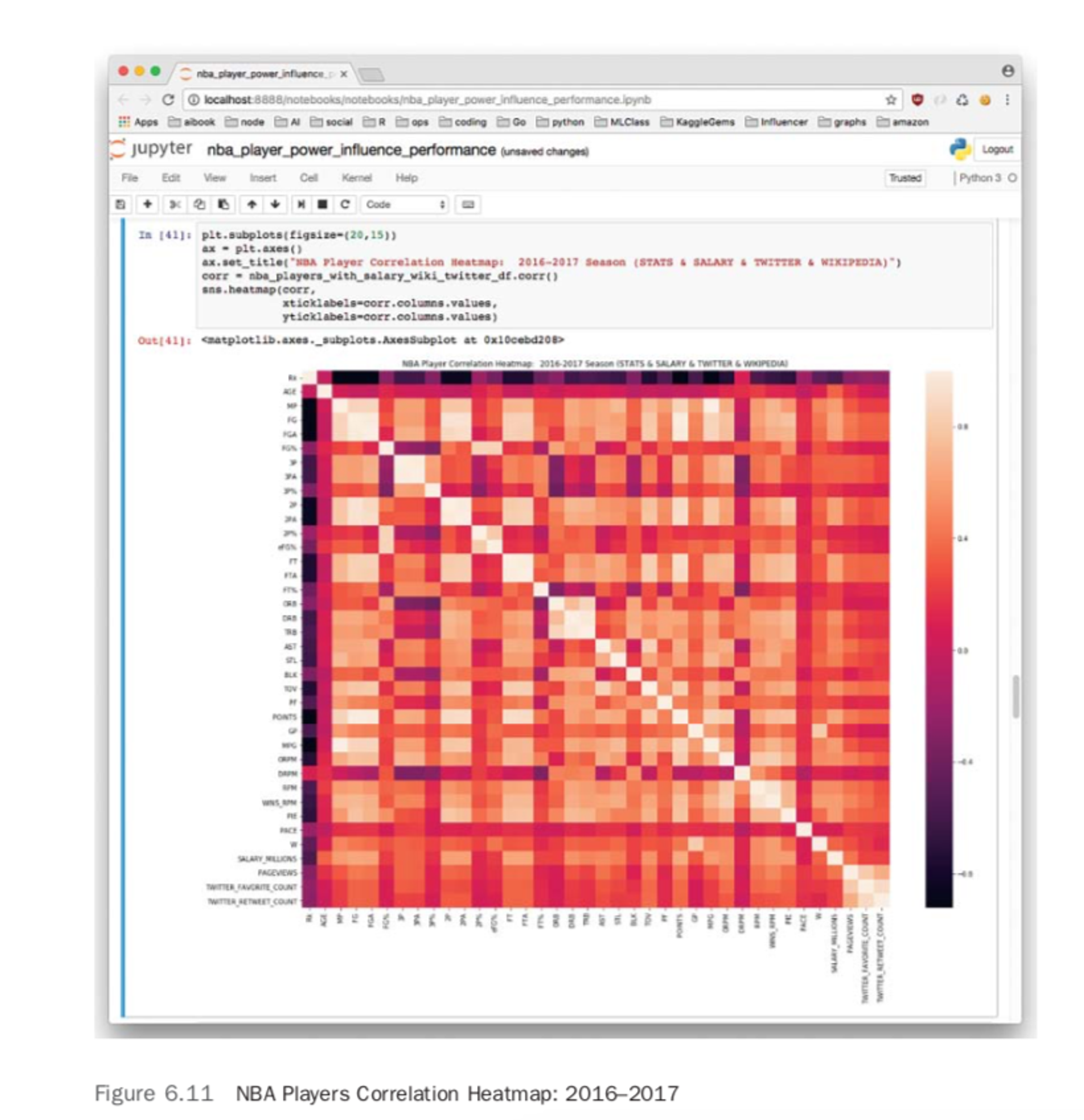 yticklabels=corr.columns.values)Figure 6.11 shows some fascinating correlations. Twitter engagement and Wikipedia pageviews are highly correlated. Wins attributed to player, or WINS_RPM, is also correlated with Twitter and Wikipedia. Salary and points are highly correlated as well.