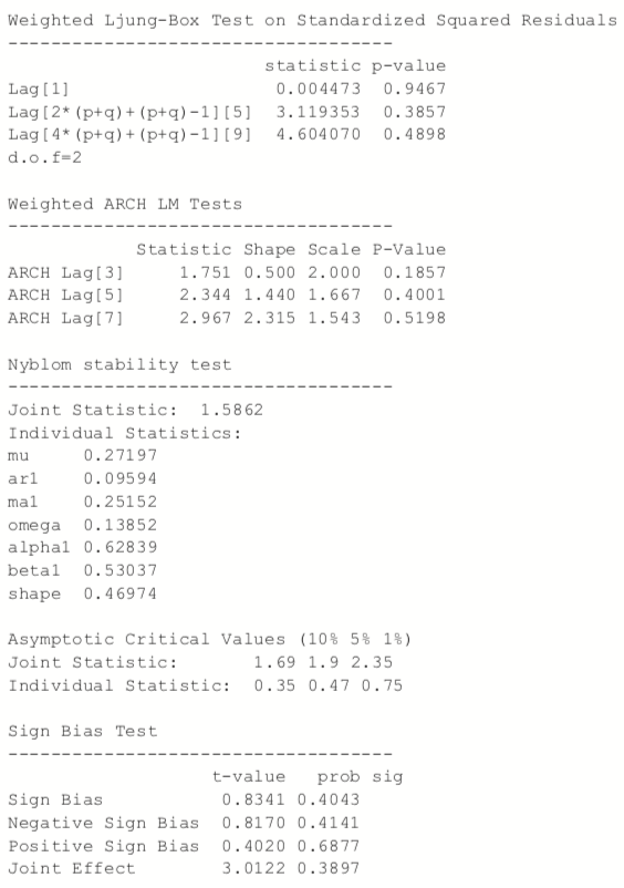 > # ARMA(1,1)attSpec1 <- ugarchspec(variance.model=list(model="sGARCH", garchOrder=c(1, 1)),+ mean.model=list(armaOrder=c(1, 1)), + distribution.model="std")> # ARMA(0,0)> attSpec2 <- ugarchspec(variance.model=list(model="sGARCH", garchOrder=c(1, 1)), mean.model=list(armaOrder=c(0, 0)), distribution.model="std") > # ARMA(0,2)attSpec3 <- ugarchspec(variance.model=list(model="sGARCH", garchOrder=c(1, 1)), mean.model=list(armaOrder=c(0, 2)), distribution.model="std")> # ARMA(1,2)attSpec4 <- ugarchspec(variance.model=list(model="sGARCH", + garchOrder=c(1, 1)),+ mean.model=list(armaOrder=c(1, 2)), + distribution.model="std")> attGarch1 <- ugarchfit(spec=attSpec1, data=attClose) > attGarch2 <- ugarchfit(spec=attSpec2, data=attClose) > attGarch3 <- ugarchfit(spec=attSpec3, >data=attClose) > attGarch4 <- ugarchfit(spec=attSpec4, data=attClose) >> infocriteria(attGarch1)