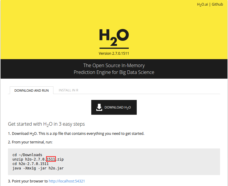 h2o_ver <- "1511"## Install H2Olocal({r <- getOption("repos"); r["CRAN"] <- "https://cran.us.r-project.org"; options(repos = r)})txt_repo <- (c(paste0(paste0("https://s3.amazonaws.com/h2o-release/h2o/master/", h2o_ver),"/R"), getOption("repos")))install.packages("h2o", repos = txt_repo, quiet = TRUE)In order to find out the latest H2O version number, go to this page and look for the last four digits as shown in the screenshot below.