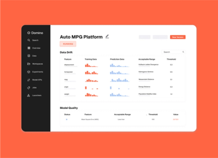 Setting up pipelines and thresholds to detect model drift in production can be a tedious job. Domino’s integrated model monitoring tool helps you detect model drift for operationalized models. Domino will automatically alert you when drift, divergence, and data quality checks exceed thresholds. It's easy to drill down to model features to modify, retrain, and redeploy models quickly. Integrated model monitoring streamlines monitoring setup with simplified configuration and reproducible development environments, designed to save time when diagnosing, rebuilding and redeploying models.
