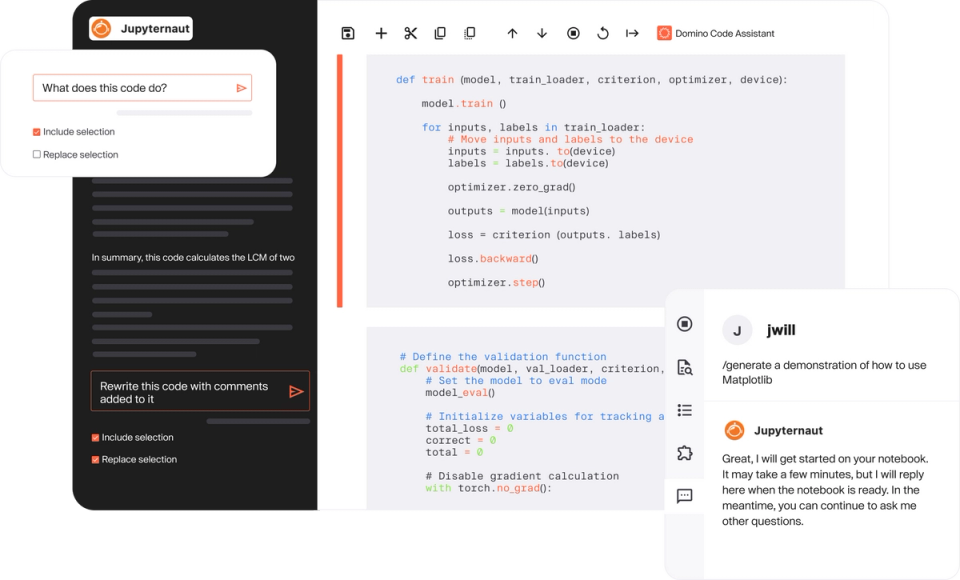 No more staring at a blank screen or wasting days dealing with setup issues. Domino’s AI Hub curates validated projects from leaders like NVIDIA and AWS. Quickly jumpstart traditional AI and Generative AI development, share best practices, and foster reuse across the organization.