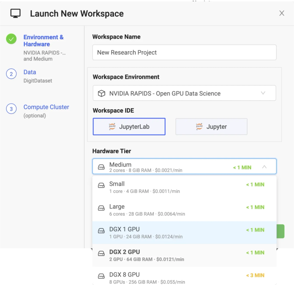 Launch on-demand workspaces with the latest NVIDIA GPUs, optimized with open source and commercial data science tools, frameworks, and libraries - free of dev ops.
