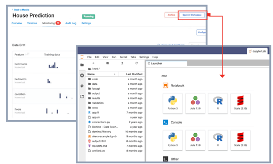 - Access historical predictions using a Domino Dataset directly from within a workspace to analyze issues surfaced in monitoring.