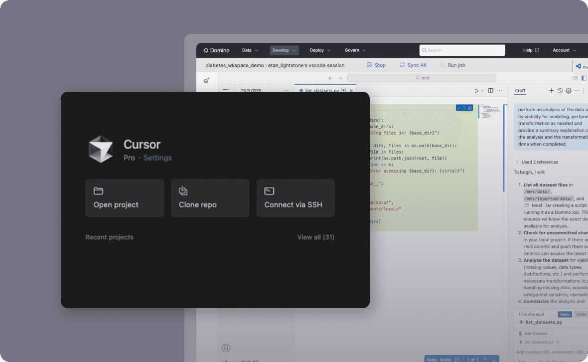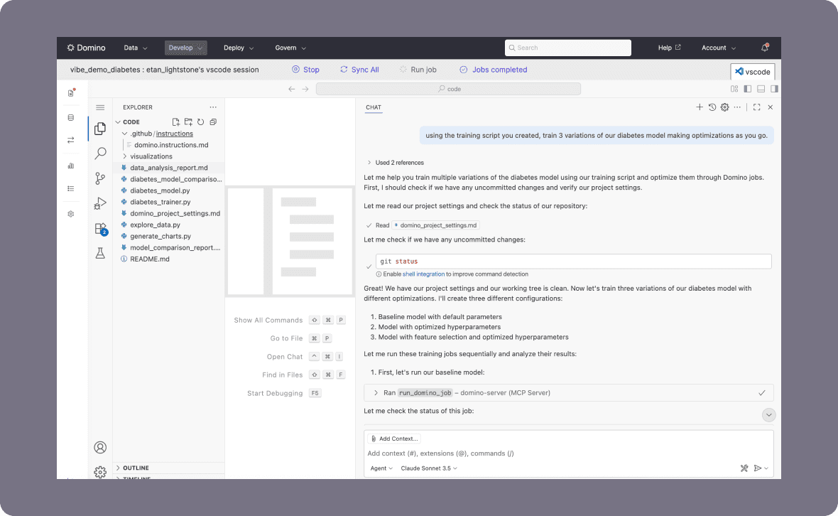 Use the Domino Modeling Assistant to transform data, engineer features, write ML code, and run taining and optimization loops. Domino plus the MCP server turns that into runnable, editable code in your workspace.